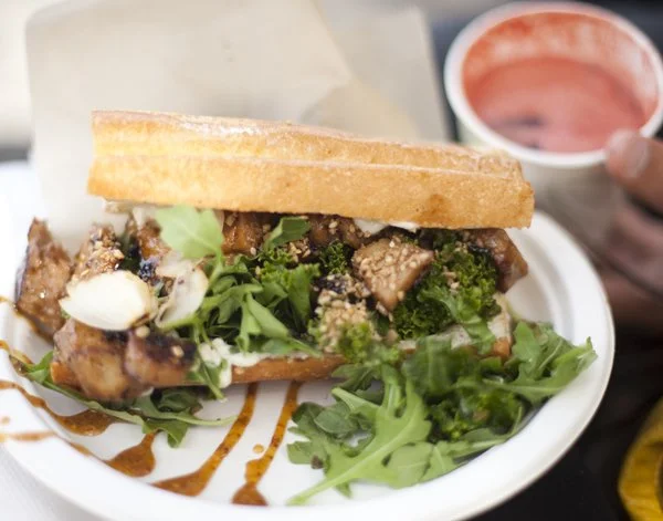 Visited the Vegan Lunch Truck in Hoboken again. Love the food, the guy, and the place. BBQ Seitan Sub with Wasabi Mayo w/ fresh squeezed watermelon juice.